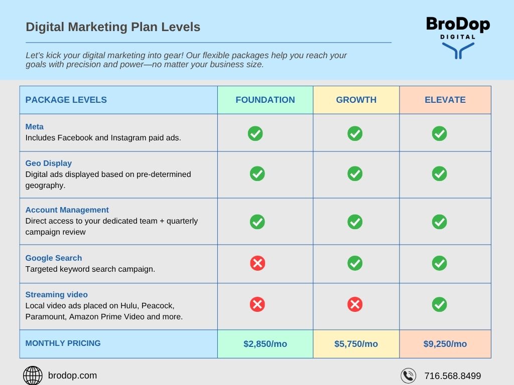 See how each BroDop plan stacks up—whether you’re building your foundation, fueling growth, or ready to elevate your brand across every channel.